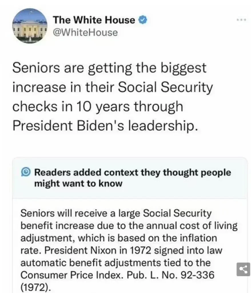 «Η αύξηση των συντάξεων γήρατος είναι η σημαντικότερη των δέκα τελευταίων ετών χάρη στον πρόεδρο Τζο Μπάιντεν», ανέφερε η ανάρτηση αυτή, στον επίσημο λογαριασμό του Λευκού Οίκου.