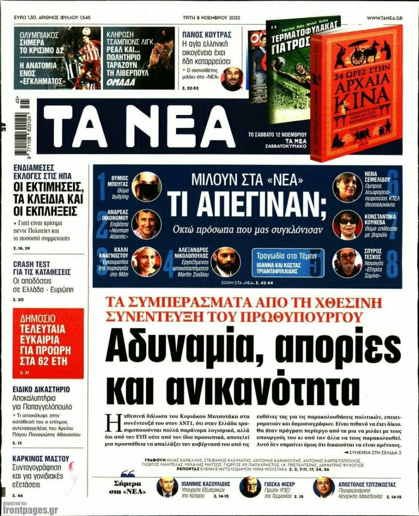 Με πρωτοσέλιδο τίτλο «Αδυναμία, απορίες και ανικανότητα» αναφερόμενα στη συνέντευξη του πρωθυπουργού στον ΑΝΤ1 κυκλοφορούν σήμερα ΤΑ ΝΕΑ.