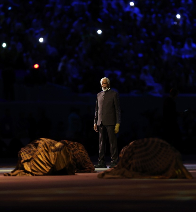 Την ίδια ώρα, ο ηθοποιός Μόργκαν Φρίμαν εμφανίστηκε στην τελετή μπροστά σε χιλιάδες άδειες θέσεις, που δεν προβλήθηκε στο Ηνωμένο Βασίλειο καθώς το BBC επέλεξε να δείξει μια αναφορά για το ιστορικό των ανθρωπίνων δικαιωμάτων στη χώρα.