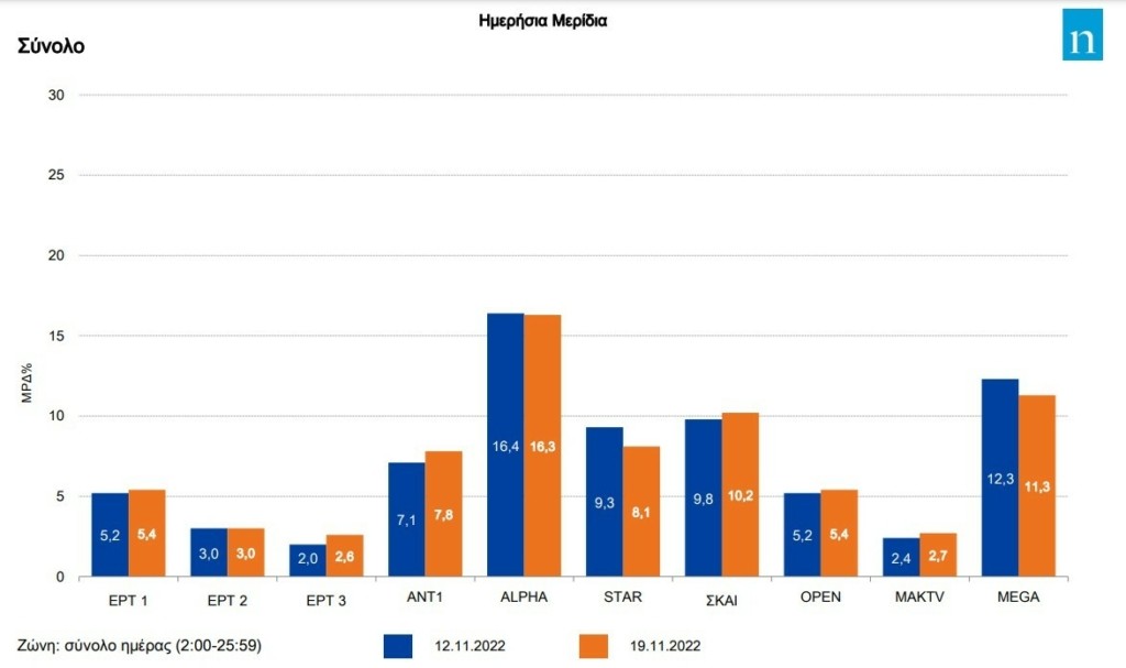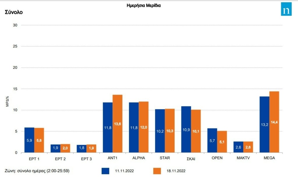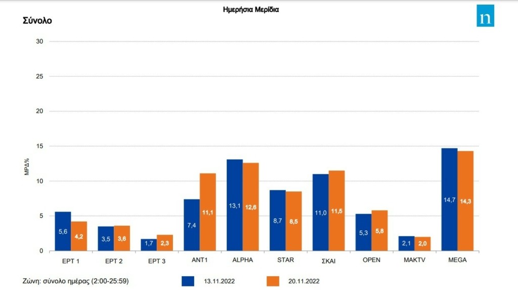 Την Κυριακή στην μοιρασιά επικράτησε το Mega κυρίως χάρη στις σειρές του prime time «Η γη της ελιάς» και «Μαύρο ρόδο». Ο Alpha υποχώρησε σε σχέση με το Σάββατο με απώλειες περι τις τέσσερις μονάδες διαφορά, αλλά διατήρησε το δεύτερο σε μέγεθος κομμάτι, ενώ χάρη στην πρεμιέρα μεταδόσεων του Μουντιάλ που διεξάγεται στο Κατάρ ο ΑΝΤ1 από την μια μέρα στην άλλη είδε το μερίδιο του να αυξάνεται κατά τέσσερις μονάδες κοντραρίστηκε με τον Σκάι, «γερό χαρτί» του οποίου αποτελεί τις Κυριακές το μουσικό σόου «The Voice».