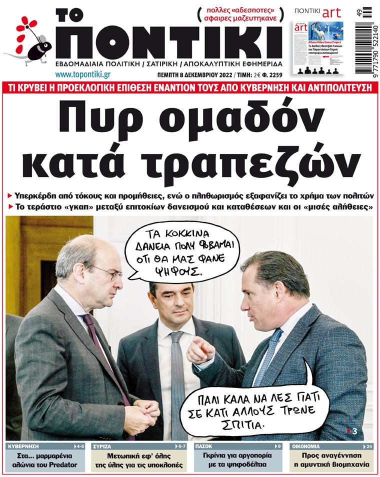 Με πρωτοσέλιδο τίτλο « Πυρ ομαδών κατά τραπεζών» και αναλυτικό – αποκαλυπτικό ρεπορτάζ για το τι κρύβει η προεκλογική επίθεση εναντίον τους από κυβέρνηση και αντιπολίτευση, αλλά και για τα υπερκέρδη από τόκους και προμήθειες, ενώ ο πληθωρισμός εξαφανίζει το χρήμα των πολιτών, κυκλοφορεί το «ΠΟΝΤΙΚΙ» το πρωί της Πέμπτης.