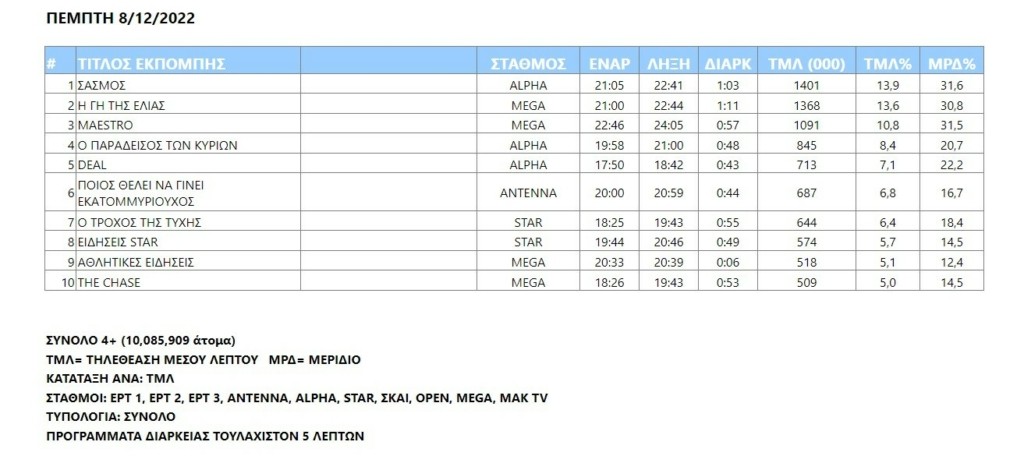 Από την πέμπτη θέση κι έπειτα κυριαρχούν τα τηλεπαιχνίδια ανεξαρτήτως σταθμού και ώρα μετάδοσης.
