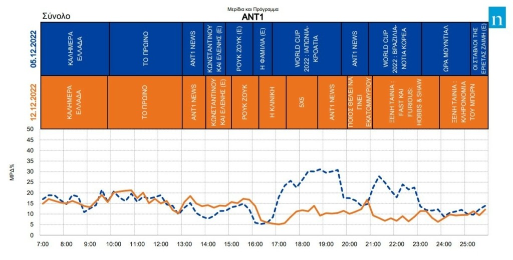 Ο ΑΝΤ1 χωρίς Μουντιάλ στο «μενού» είδε χθες το μερίδιο του να διαμορφώνεται στο 11,4%, καλύτερο από εκείνο της Κυριακής και φαίνεται ότι χάρη στην απογευματινή ζώνη συντήρησε «δυνάμεις» που τον κράτησαν πάνω από την περιοχή του 10%.