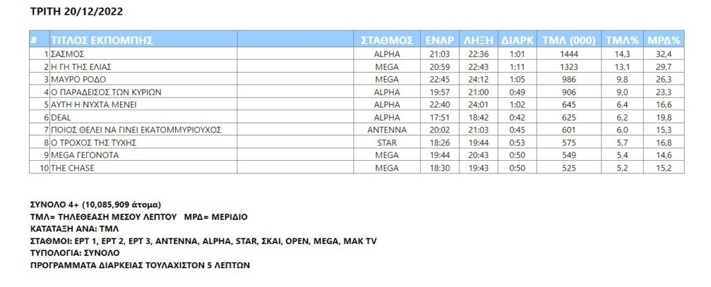Μ αυτά και με εκείνα ο Alpha είδε, με την δραματική σειρά, τον δείκτη τηλεθέασης να σκαρφαλώνει στο 14,3% (από 13,7%) που είχε σημειώσει τη Δευτέρα, ποσοστό που αντιστοιχεί σε 1.444.000 τηλεθεατές
