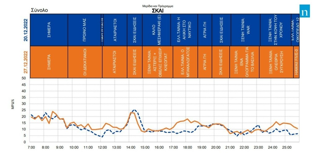 Το μίγμα προγράμματος του Alpha ήταν τέτοιο που ακόμα στη μεταχριστουγεννιάτικη περίοδο κατάφερε χθες (27/12) να περιορίσει τις απώλειες του, έναντι του βασικού αντιπάλου του, το Mega, όχι μόνον σε εβδομαδιαία βάση.