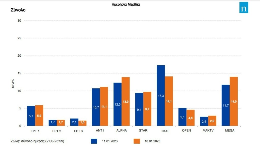 Για διαφορά 0,1% το Mega πήρε το δεύτερο σε μέγεθος μερίδιο από την πίτα τηλεθέαση της Τετάρτης, ενώ ο Alpha έπειτα από πολύ καιρό (εξαιρείται η περίοδος του Μουντιάλ) είχε το τρίτο σε μέγεθος κομμάτι.