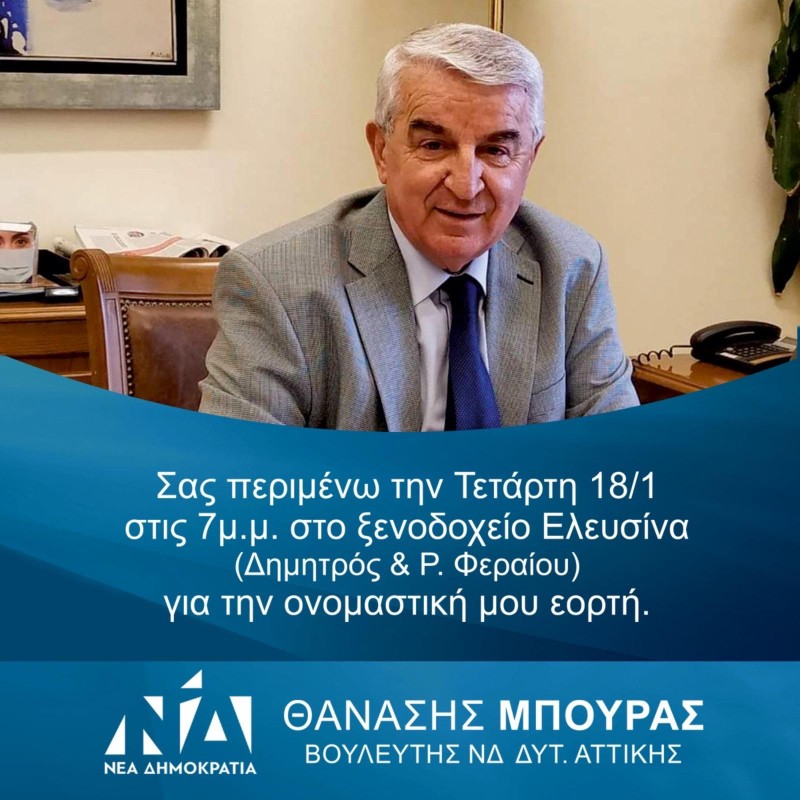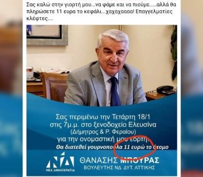 Πιο συγκεκριμένα, τις προηγούμενες ημέρες, στο διαδίκτυο εμφανιζόταν μία φωτογραφία – πρόσκληση του βουλευτή προς τους ψηφοφόρους για να του ευχηθούν για την ονομαστική του εορτή στο ξενοδοχείο «Ελευσίνα».