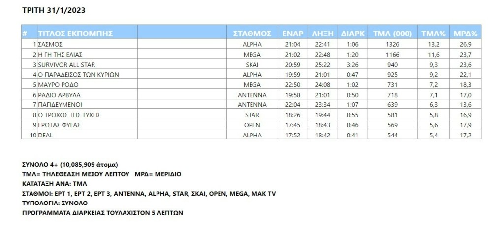 Ακλόνητος στην πρώτη θέση παρέμεινε ο «Σασμός» και την Τρίτη, βελτιώνοντας την τηλεθέαση του, σύμφωνα με τις μετρήσεις τηλεθέασης της Nielsen.