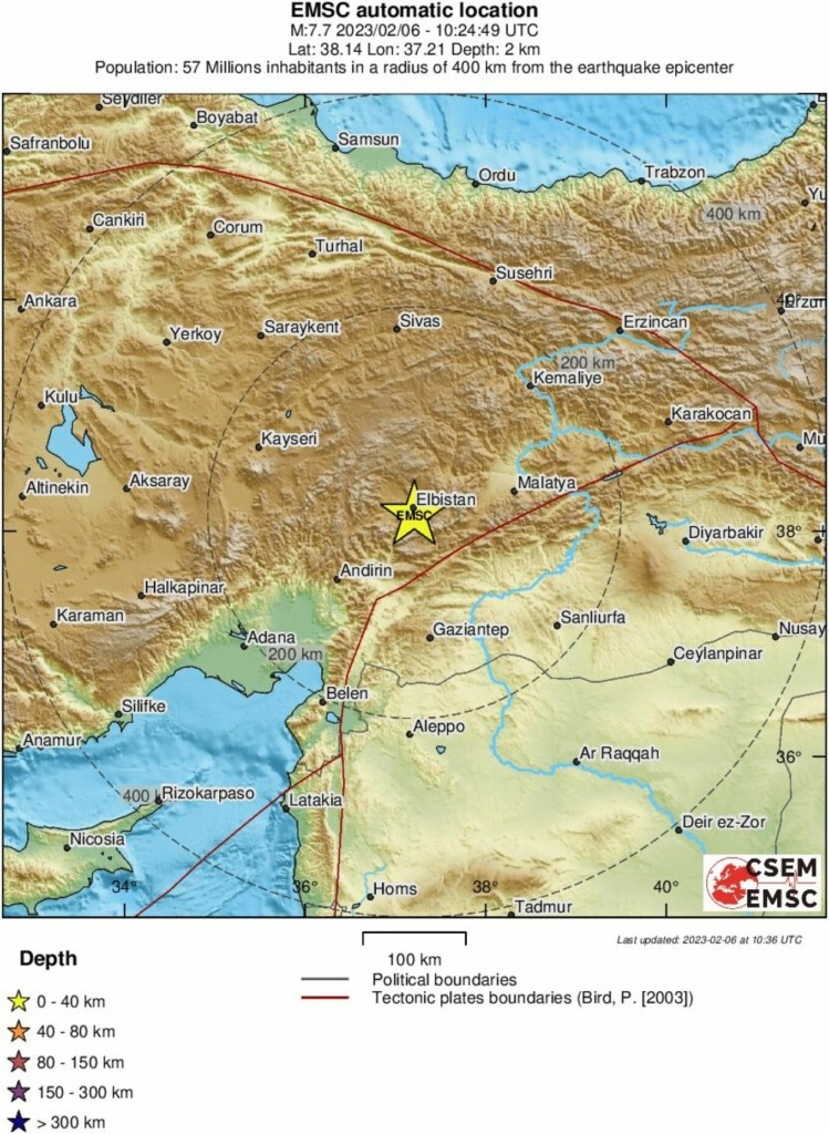 Ο σεισμός σημειώθηκε 67 χιλιόμετρα βόρεια, βορειοανατολικά της πόλης Καχραμανμαράς και είχε εστιακό βάθος μόλις 2 χιλιομέτρων! Από την πλευρά της η τουρκική AFAD ανακοίνωσε ότι σεισμός μεγέθους 7,6 βαθμών σημειώθηκε με επίκεντρο την πόλη Καχραμανμαράς.