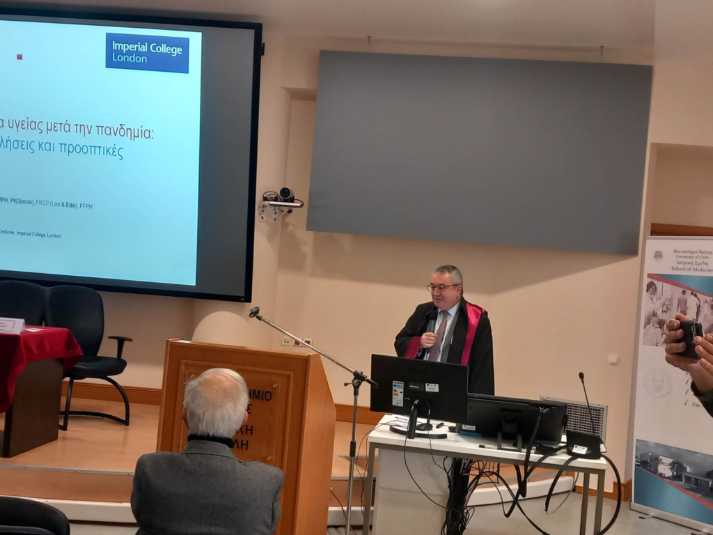 Απευθυνόμενος στον Περιφερειάρχη Κρήτης, και με αφορμή μια διαφάνεια που παρουσίασε κατά την ομιλία του για τη διαφορά του προσδόκιμου ζωής στη Μεγάλη Βρετανία από περιοχή σε περιοχή, είπε ότι θα ήθελε να ξέρει ποιά είναι και η αντίστοιχη εικόνα στην Κρήτη.