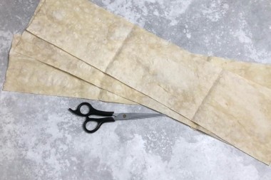 4. Αφαιρέστε τις άκρες, αν είναι στρογγυλή η πίτα και κόψτε την κάθε μία σε λωρίδες, πλάτους 8 εκατοστών περίπου, με ένα ψαλίδι ή ένα κοφτερό μαχαίρι. Η κάθε πίτα θα βγάλει 3 λωρίδες περίπου. Διαχωρίστε τις, καθώς οι αραβικές έχουν 2 στρώσεις και έτσι θα καταλήξετε με 6 λωρίδες μακρόστενες και λεπτές.