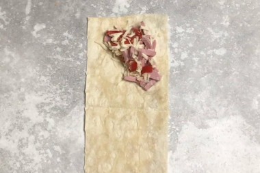 5. Στην άκρη της κάθε λωρίδας, βάλτε μια κουταλιά της σούπας από τη γέμιση, τοποθετώντας την ελαφρώς στην μία άκρη του φύλλο. Διπλώστε διαγώνια προσέχοντας να μην αδειάσει η γέμιση, συνεχίστε το τύλιγμα σε ευθεία γραμμή και επαναλάβετε με τον γνωστό τρόπο που τυλίγουμε τα τρίγωνα τυροπιτάκια.