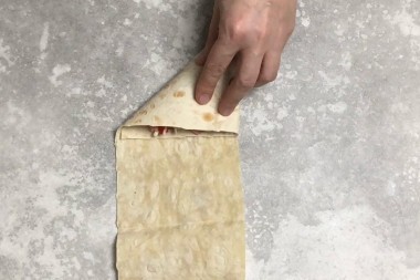 Αν προεξέχει κάποιο κομμάτι φύλλου στο τέλος, είτε κλείστε το μέσα στην εσοχή, ή κόψτε το με το ψαλίδι για να είναι πιο προσεγμένο το τυροπιτάκι. Κάντε την ίδια διαδικασία με τις υπόλοιπες λωρίδες και με τη γέμιση.