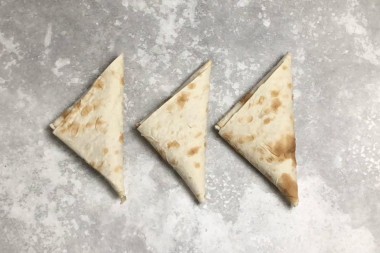 6. Σπάστε το αυγό και ανακατέψτε το με λίγο νερό και λίγο αλάτι για γεύση, αν επιθυμείτε. Βουτήξτε το κάθε τρίγωνο στο μίγμα, ώστε να παναριστεί καλά απ’ όλες τις πλευρές.
