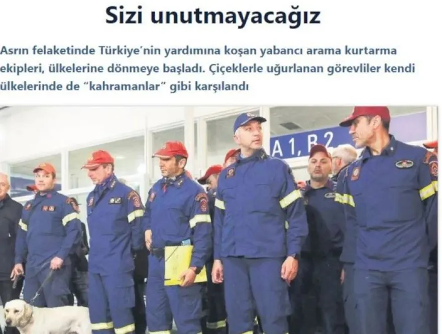 «Δεν θα σας ξεχάσουμε», είναι το «ευχαριστώ» της εφημερίδας Sabah που εκφράζεται με πολύ θερμά λόγια για το τιτάνιο έργο των Ελλήνων διασωστών.