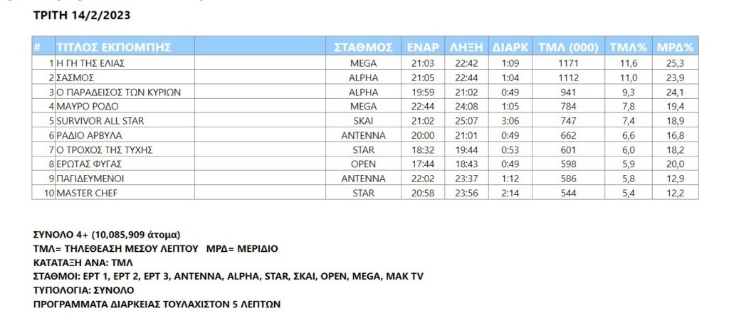 Πέντε σταθμοί με διψήφια ποσοστά στα μερίδια τους χθες – Στο Mega το μεγαλύτερο