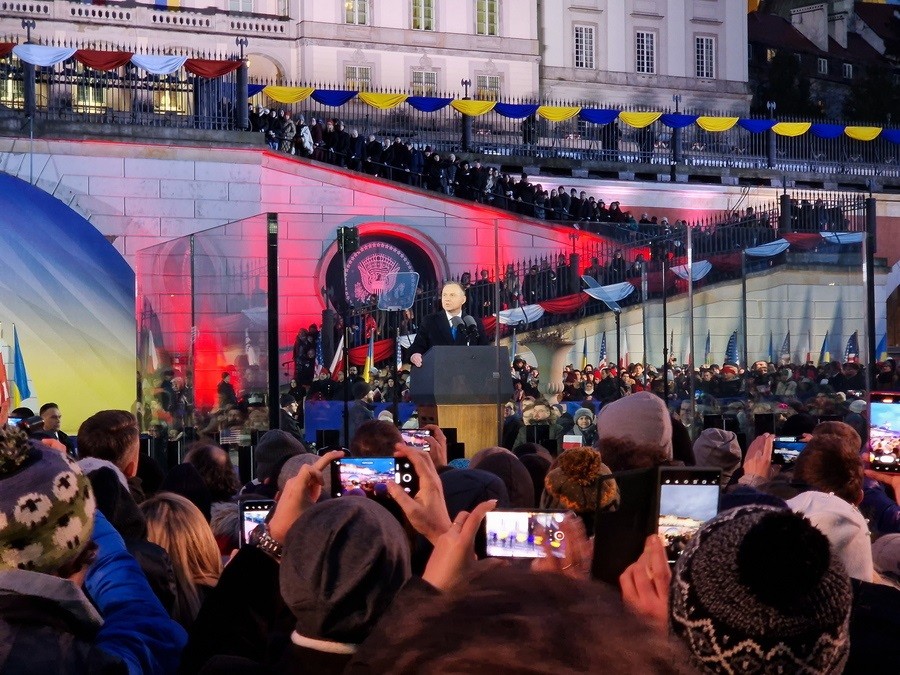 Από την πλευρά του, ο πρόεδρος της Πολωνίας Αντρέι Ντούντα που μίλησε νωρίτερα έστειλε μήνυμα αλληλεγγύης στον δοκιμαζόμενο ουκρανικό λαό. «Ζήτω η ελεύθερη Ουκρανία, ζήτω η συμμαχία της Δημοκρατίας της Πολωνίας με τις Ηνωμένες Πολιτείες», είπε και επευφημήθηκε από τους παρευρισκόμενους. Απηύθυνε έκκληση στις κυβερνήσεις των χωρών μελών του ΝΑΤΟ να ενισχύσουν τις ουκρανικές ένοπλες δυνάμεις. «Μη διστάζετε» να παράσχετε στρατιωτική βοήθεια» στην Ουκρανία, είπε χαρακτηριστικά.