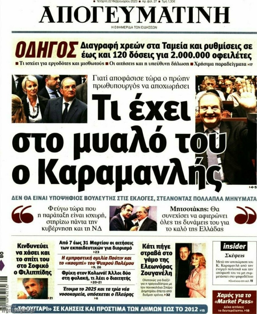 Η Απογευματινή προσπαθεί στο πρωτοσέλιδο θέμα της να εξηγήσει «Τι έχει στο μυαλό του ο Καραμανλής» καθώς και γιατί αποφάσισε τώρα να αποχωρήσει απο την πολιτική. Η ίδια εφημερίδα αφιερώνει το κύριο άρθρο της στην αποχώρηση Καραμανλή, ενώ φιλοξενεί τρεις φωτογραφίες του στο πρωτοσέλιδο της. Μία με την συζυγό του Νατάσα, μία με τον Κυριάκο Μητσοτάκη και μία όπου ο Καραμανλής απεικονίζεται μόνος του