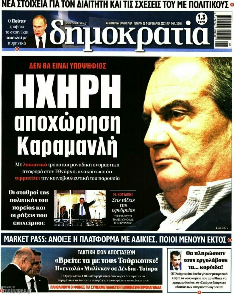 Η Δημοκρατία χαρακτηρίζει την αποχώρηση Καραμανλή ώς «ηχηρή» και συνοδεύει την είδηση με μια μεγάλη φωτογραφία πορτραίτο του πρώην πρωθυπουργού. Η εφημερίδα έχει αφιέρωμα στους σταθμούς της πολιτικής του πορείας και τις ρήξεις που επιχείρησε ενώ αποκαλύπτει «τι είπαν στο τηλέφωνο με τον Κυριάκο»