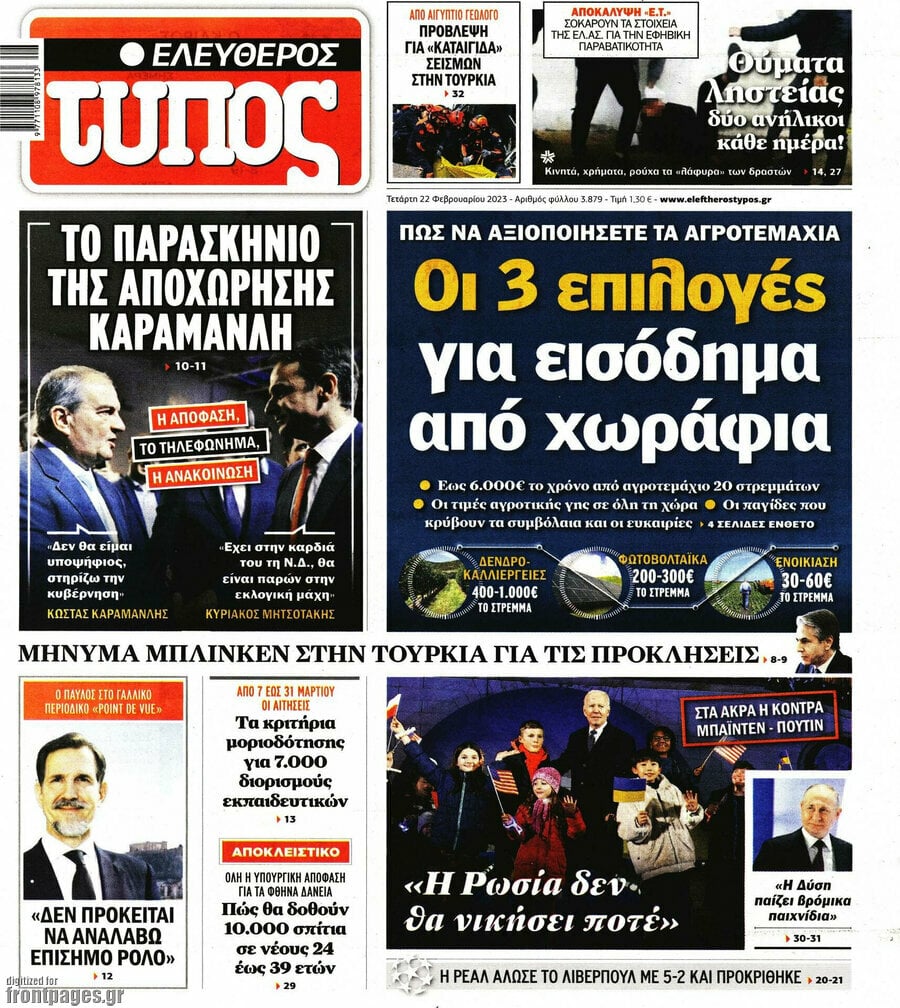 Ο Ελεύθερος Τύπος το έχει και αυτός δευτερο θέμα, με σχεδον πανόμοιοτυπο τίτλο με αυτόν της Καθημερινής: «Η απόφαση, το τηλεφώνημα, η ανακοίνωση». Εστιάζει δε, στην παρουσιάση του παρασκηνίου.