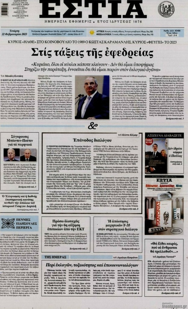 Η Εστία αφιερώνει το πρωτοσέλιδό της στον Κώστα Καραμανλή με έναν διθυραμβικό τίτλο: «Στις τάξεις της εφεδρείας», ενώ ο υπερτιτλος αναφέρει «Κύριος ήρθε, κύριος φεύγει ο πρώην πρωθυπουργός».