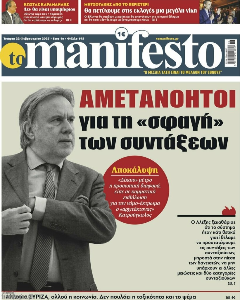 Τέλος το Μανιφέστο αναφέρει την είδηση ξερά με ένα μικρό μονοστηλο στο πάνω αριστερό τμήμα του πρωτοσέλιδου. Ο τίτλος είναι: «Κώστας Καραμανλής: Δεν θα είναι υποψήφιος»
