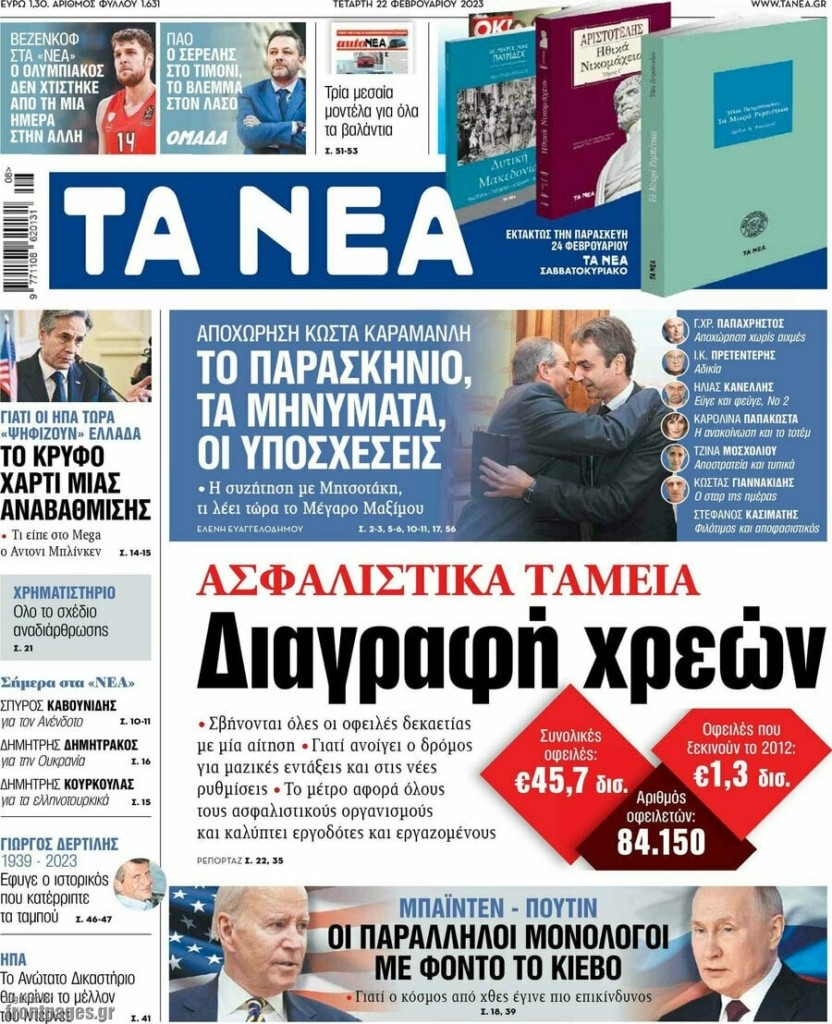 Τα Νέα επίσης με έναν παρόμοιο τίτλο το έχουν δεύτερο θέμα: «Το παρασκήνιο, τα μηνύματα, οι υποσχέσεις». Η φιλοκυβερνητική εφημερίδα φιλοξενεί σήμερα αρθρογραφία εφτά συνεργατών της για τον πρώην πρωθυπουργό και την όποια συνεισφορά του στον δημόσιο βίο.