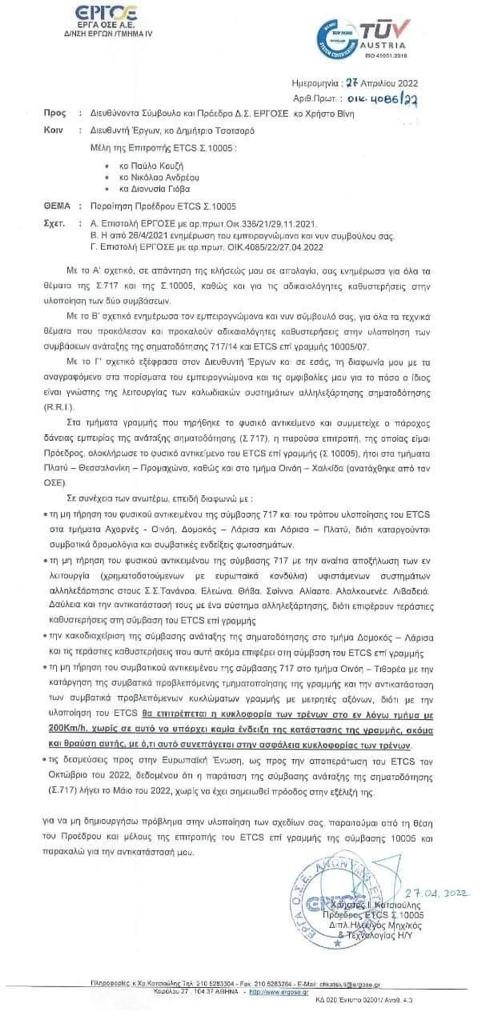 Πιο συγκεκριμένα, κατέγραφε την ημιτελή συντήρηση του σιδηροδρομικού δικτύου και έκρουε κώδωνα κινδύνου για την ασφάλεια, αναφέροντας ότι συγκεκριμένο τμήμα του δικτύου, στο οποίο θα γίνεται «κυκλοφορία τρένων με 200 km/h, χωρίς σε αυτό να υπάρχει καμία ένδειξη της κατάστασης της γραμμής, ακόμα και θραύση αυτής, με ό,τι αυτό συνεπάγεται στην ασφάλεια κυκλοφορίας των τρένων».