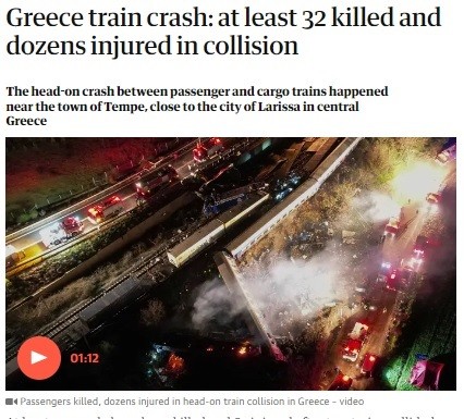 «Επιβατική αμαξοστοιχία στην Ελλάδα που μετέφερε εκατοντάδες ανθρώπους συγκρούστηκε με επερχόμενη εμπορική αμαξοστοιχία σε ένα πύρινο… ναυάγιο στο βόρειο τμήμα της χώρας νωρίς το πρωί της Τετάρτης, με αποτέλεσμα να σκοτωθούν 32 άτομα και να τραυματιστούν τουλάχιστον 85, σύμφωνα με αξιωματούχους.
