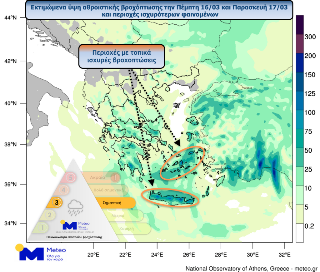 Σύμφωνα με την κατηγοριοποίηση του επεισοδίου βροχόπτωσης (RPI), η οποία εφαρμόζεται από τη μονάδα Meteo του Εθνικού Αστεροσκοπείου Αθηνών, το αναμενόμενο επεισόδιο βροχόπτωσης κατά τη διάρκεια της Πέμπτης 16/03 κατατάσσεται στην Κατηγορία 2 (Μέτρια).