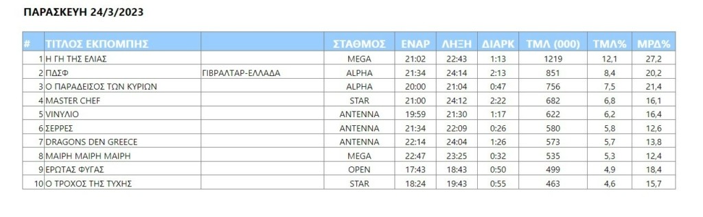 Η Παρασκευούλα «κύλησε» χαλαρά, πλην όμως στο prime time οι τηλεθεατές είχαν επιλογές αλλά περιορίστηκαν στα κλασικά και αναμενόμενα, ήτοι το σιριαλ «Η γη της ελιάς», το ματς Γιβραλτάρ- Ελλάδας για το Euro 2024, το «Ο παράδεισος των κυριών».