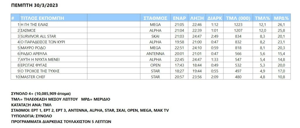 Συγκριτικά με την Τετάρτη, σημειώθηκαν μεταβολές στις άλλες θέσεις του Top 10 της Πέμπτης στις οποίες μεταξύ άλλων ξεχώρισαν το τηλεπαιχνίδι «Ο τροχός της τύχης» και το μαγειρικό ριάλιτι «MasterChef».