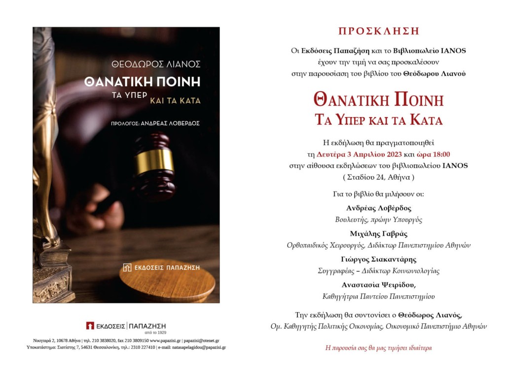 Το βιβλίο γράφει ο Καθηγητής Θεόδωρος Λιανός, φέρει τον τίτλο: «Θανατική Ποινή Τα Υπέρ και τα Κατά» και κυκλοφορεί από τις εκδόσεις Παπαζήση. Η παρουσίαση θα γίνει στο βιβλιοπωλείο «ΙΑΝΟΣ». Το θέμα της θανατικής ποινής έχει απασχολήσει πολλές φορές το πολιτικό προσωπικό της χώρας ενώ διάφοροι ακραίοι το επαναφέρουν συνεχώς στο τραπέζι των συζητήσεων μετά από στυγερά εγκλήματα.