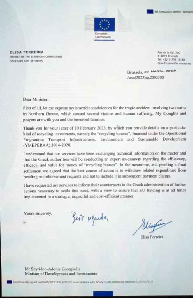 «Όπως αποκάλυψε η Εφημερίδα των Συντακτών, η Κομισιόν, με επιστολή της, αφήνει σαφείς αιχμές για αδιαφάνεια στην ανακύκλωση, αλλά και σοβαρά ζητήματα απόδοσης του εξοπλισμού και παγώνει την ευρωπαϊκή χρηματοδότηση για το έργο, ζητώντας τα ρέστα από τον άριστο υπουργό Ανάπτυξης και την κυβέρνηση», επισημαίνει.