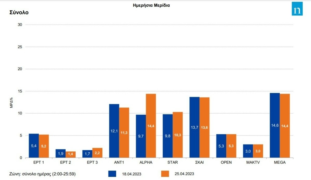 Σημάδια σταθερότητας εμφάνισε και ο ΑΝΤ1, αν και με τάση μικρής υποχώρησης την Τρίτη. Ακλόνητο επίσης και το Star. Και προχθές και χθες είχε το ίδιο μερίδιο. Σχεδόν ισοδύναμα ήταν Open και ΕΡΤ1.