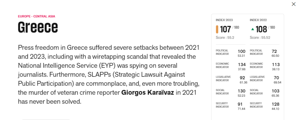 «Αρκετές χώρες έχουν περιορίσει τη δημοσιογραφική εργασία με το πρόσχημα της “εθνικής ασφάλειας”. Στην Ελλάδα (107η), η κατασκοπεία δημοσιογράφων από τις υπηρεσίες πληροφοριών και μέσω του spyware Predator αντιπροσώπευε τη μεγαλύτερη παραβίαση της ελευθερίας του Τύπου στην Ευρωπαϊκή Ένωση το 2022 και εξηγεί γιατί η Ελλάδα έχει τη χαμηλότερη κατάταξη από οποιαδήποτε άλλη χώρα της ΕΕ στον δείκτη του 2023». αναφέρεται.