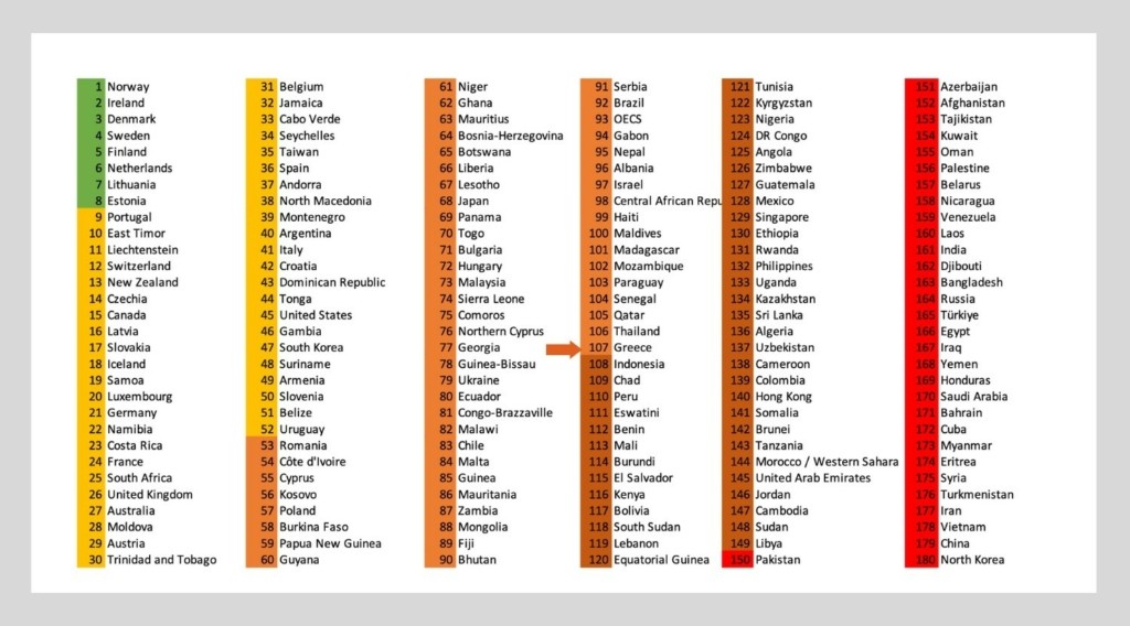 Αναλυτικά οι κατατάξεις της Ελλάδας ανάμεσα στις 180 χώρες: