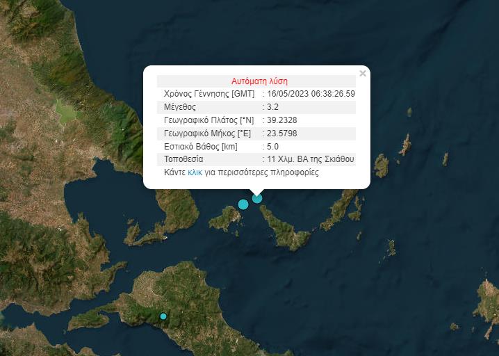 Σεισμός 3,2 Ρίχτερ σημειώθηκε στη Σκιάθο το πρωί της Τρίτης (16/5), σύμφωνα με την αυτόματη λύση του Γεωδυναμικού Ινστιτούτου.