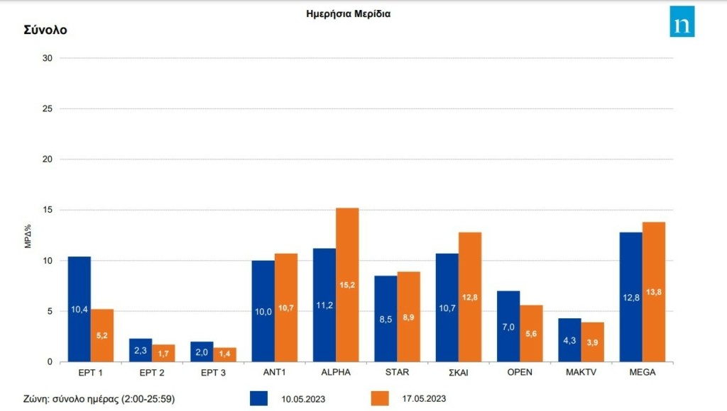 Το μερίδιο του ΑΝΤ1 είχε μεταβολή, από την Τρίτη στην Τετάρτη, σχεδόν δύο ποσοστιαίων μονάδων, με πτωτική τάση, όπως επίσης και του Star αλλά σε μικρότερο βαθμό (-0,6%). Οι αποδόσεις τους ήταν καλύτερες από εκείνες που είχαν καταφέρει την ίδια ημέρα της προηγούμενης εβδομάδας.