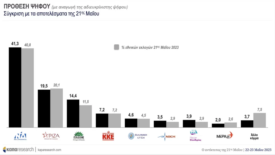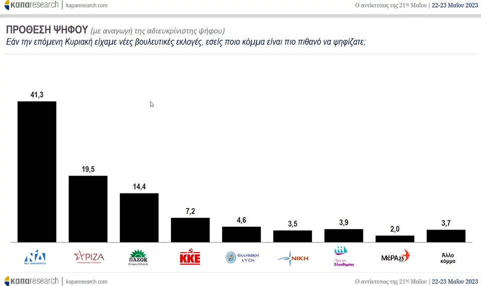 Στην πρόθεση ψήφου με αναγωγή επί των αναποφάσιστων, η ΝΔ εκτοξεύεται στο 41,3%, εισπράττοντας μάλιστα 1,5% σε σχέση με τις εκλογές της Κυριακής.