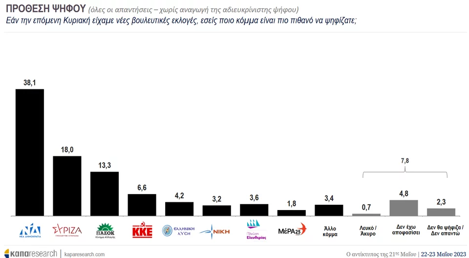 Η ΝΔ συγκεντρώνει 38,1%, ο ΣΥΡΙΖΑ πέφτει στο 18%, το ΠΑΣΟΚ ανεβαίνει στο 13,3%, ενώ μπαίνουν στη Βουλή Πλεύση Ελευθερίας και ΝΙΚΗ. Η αδιευκρίνιστη ψήφος αγγίζει το 7,8%.