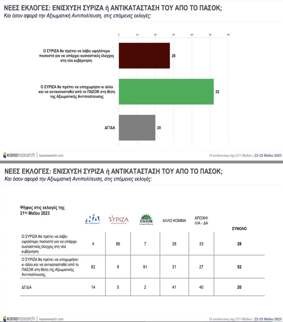 Όσον αφορά την αξιωματική αντιπολίτευση, στις επόμενες εκλογές οι πολίτες απάντησαν πως σε ποσοστό 52% ο ΣΥΡΙΖΑ θα πρέπει να υποχωρήσει κι άλλο και να αντικατασταθεί από το ΠΑΣΟΚ στη θέση της αξιωματικής αντιπολίτευσης.