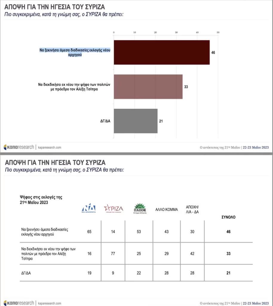 Μετά τη συντριπτική ήττα του ΣΥΡΙΖΑ στις εκλογές της 21ης Μαΐου, οι ψηφοφόροι πιστεύουν σε ποσοστό 46% πως θα πρέπει να ξεκινήσουν άμεσα διαδικασίες διαδοχής του Αλέξη Τσίπρα και εκλογής νέου αρχηγού, ενώ σε ποσοστό 33% υποστηρίζουν πως θα πρέπει ο ΣΥΡΙΖΑ να διεκδικήσει εκ νέου την ψήφο των πολιτών με πρόεδρο τον Αλέξη Τσίπρα.