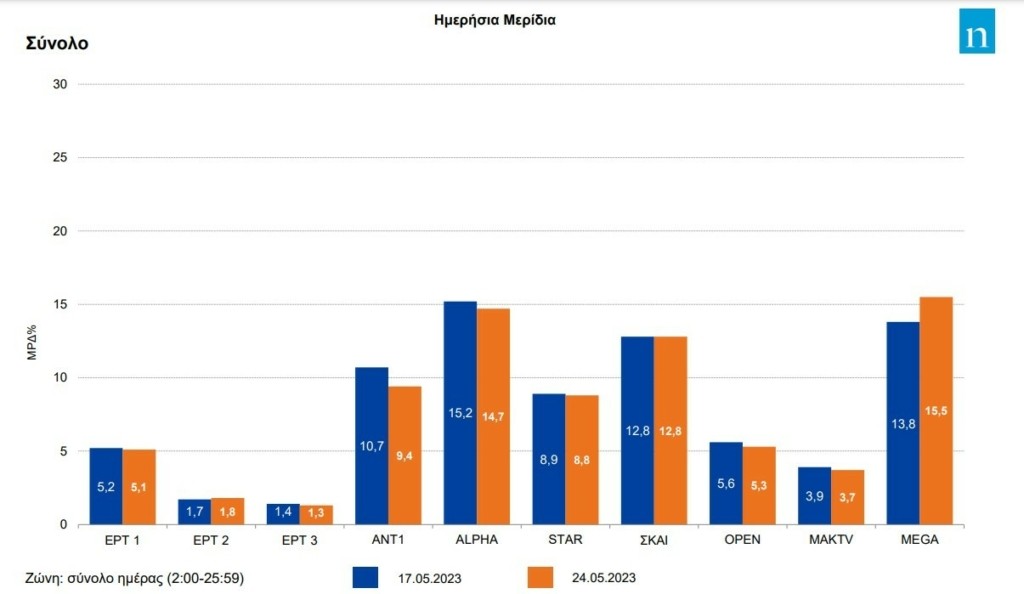 Κατά τα λοιπά το Open είχε μερίδιο 5,3%, μειωμένο κατά 0,6% συγκριτικά με την Τρίτη, ενώ η ΕΡΤ1 πρόσθεσε 0,2% στο κομμάτι της το οποίο διαμορφώθηκε στο 5,1%.