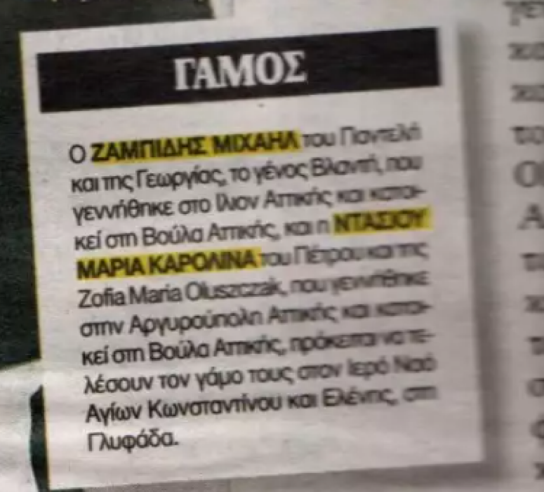 «Ο Ζαμπίδης Μιχαήλ του Παντελή και της Γεωργίας, το γένος Βλαντή, που γεννήθηκε στο Ίλιον Αττικής και κατοικεί στη Βούλα Αττικής, και η Ντάσιου Μαρία Καρολίνα του Πέτρου και τηυς Ζofia Maria Oluszczak, που γεννήθηκε στην Αργυρούπολη Αττικής και κατοικεί στη Βούλα Αττικής, πρόκειται να τελέσουν τον γάμο τους στον Ιερό Ναό Αγίων Κωνσταντίνου και Ελένης στη Γλυφάδα» αναφέρεται συγκεκριμένα στην αναγγελία του γάμου τους.