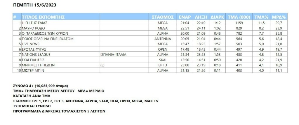 Ανέβηκαν θέσεις στην κλίμακα τηλεθέασης οι εκπομπές «Ποιος θέλει να γίνει εκατομμυριούχος», «Live news», «Έρωτας φυγάς» και στην έβδομη θέση πλασαρίστηκε το ματς Ισπανίας- Ιταλίας που συγκέντρωση την προσοχή 483.000 τηλεθεατών.