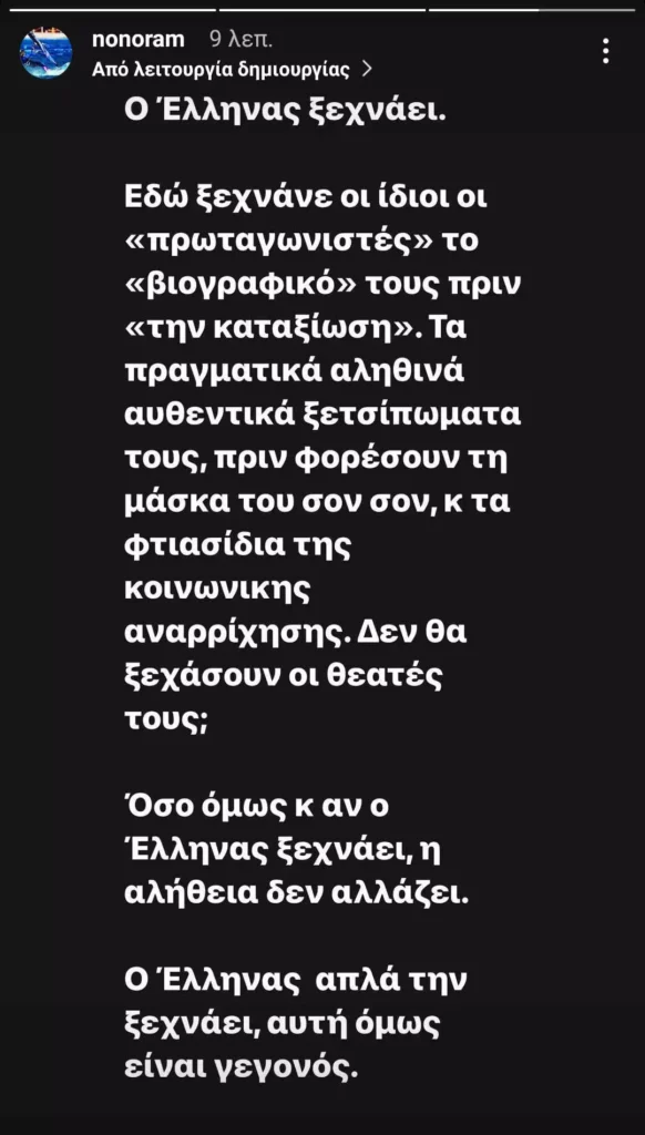«Ο Έλληνας ξεχνάει. Εδώ ξεχνάμε οι ίδιοι οι “πρωταγωνιστές”, το “βιογραφικό” τους πριν την “καταξίωση”. Τα πραγματικά αυθεντικά ξετσιπώματα τους, πριν φορέσουν τη μάσκα του σον σον και τα φτιασίδια της κοινωνικής αναρρίχησης. Δεν θα ξεχάσουν οι θεατές τους; Όσο όμως και αν ο Έλληνας ξεχνάει, η αλήθεια δεν αλλάζει. Ο Έλληνας απλά την ξεχνάει, αυτή όμως είναι γεγονός», έγραψε η παρουσιάστρια του Mega, δηλώνοντας την αγανάκτησή της.
