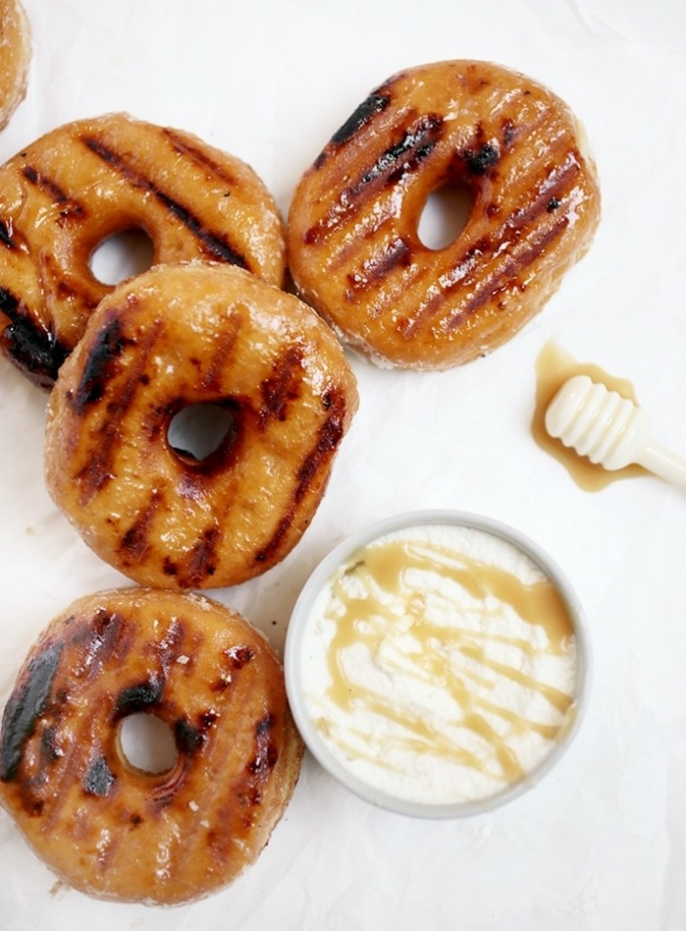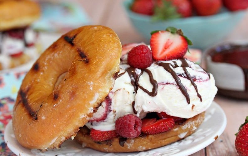 Προθερμάνετε την ψησταριά υγραερίου σε μέτρια φωτιά, κλείστε το καπάκι και αφήστε την να πιάσει θερμοκρασία για 5-10 λεπτά. Κόψτε τους λουκουμάδες στη μέση κατά μήκος και αλείψτε κάθε κομμένη πλευρά με μια λεπτή στρώση βουτύρου. Ψήστε τους στη σχάρα, με την κομμένη πλευρά προς τα κάτω, για περίπου 60 δευτερόλεπτα, ανά πλευρά. Έχετε το νου σας συνεχώς διότι μπορεί πολύ εύκολα να μαυρίσει και να καεί η ζάχαρη, ειδικά στην γλασαρισμένη πλευρά του ντόνατς. Οι χρόνοι ψησίματος μπορεί να διαφέρουν, γι’ αυτό και θέλει συνεχή παρακολούθηση. Μόλις ψηθούν και από τις δύο πλευρές, αφαιρέστε τους λουκουμάδες και αφήστε τους να χλιαρύνουν αλλά αν μην κρυώσουν εντελώς. Γεμίστε το κάθε ντόνατς με μια μπάλα παγωτό, πασπαλίστε με τα κομμένα φρούτα, περιχύστε με το σιρόπι που επιθυμείτε και σερβίρετε αμέσως.