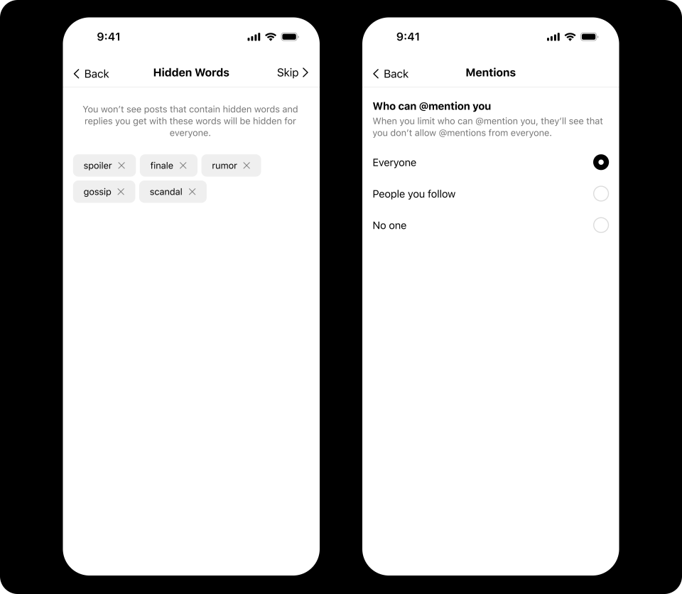 Οι χρήστες μπορούν να ελέγχουν ποιος άλλος χρήστης αναφέρεται σε αυτούς, ποιος μπορεί να τους απαντήσει, ενώ υπάρχουν φίλτρα αποκλεισμού απαντήσεων που περιέχουν συγκεκριμένες λέξεις και όσοι κάνουν τέτοιες αναρτήσεις μπορεί να μπλοκάρονται.