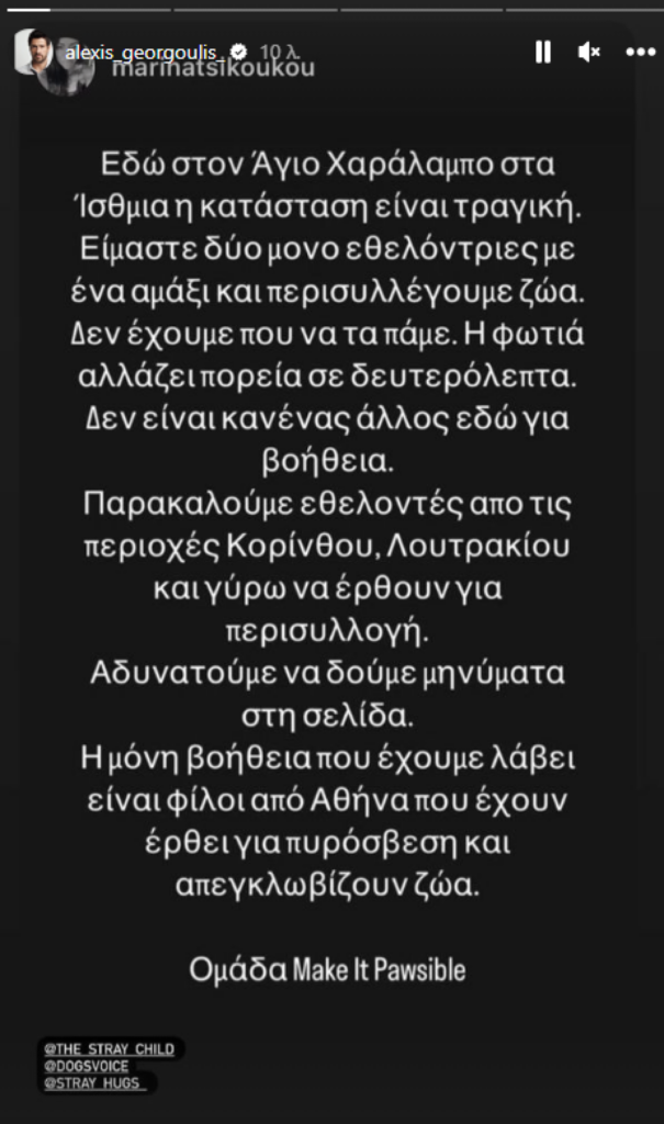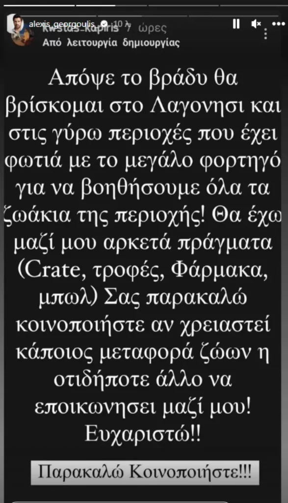 Το απόγευμα της Τρίτης 18 Ιουλίου και μέσω stories, ο Αλέξης Γεωργούλης αναδημοσίευσε στιγμιότυπα εθελοντών που προσφέρουν βοήθεια, αλλά και σελίδων που ζητούν βοήθεια για ζώα.